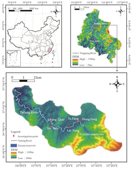 The Tufang River is located in Tufang Town, Changting County, Longyan City, China. It has a catchment area of 150 km2, a river length of 40 km, and a river slope of 8.1‰. It is a typical mountainous river with a steep slope, a rapid natural flow, and many gravels and boulders at the bottom of the riverbed. Xiyuan, Hongfang, Tufang, Laifang, Shimen, Changqiao, and other diversion-type small hydropower stations are successively distributed from upstream to downstream of the Tufang River. This density of hydropower stations has resulted in a long river cutoff length which does not align with the water usage habits of local residents.
