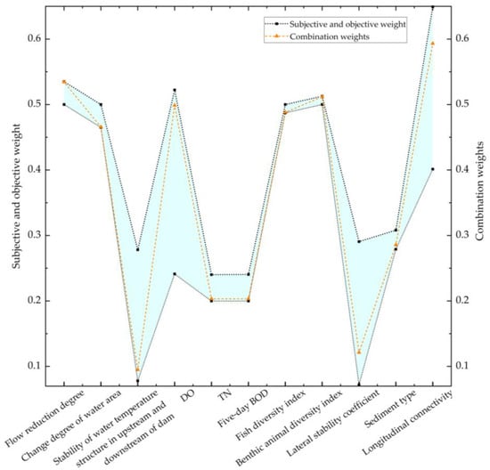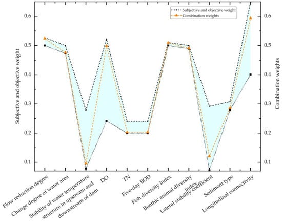 Index weights are mainly determined by subjective or objective weighting methods [27]. Subjective weighting methods directly reflect the preferences of decision makers but ignores the values of the original index data. These include the analytic hierarchy process (AHP) [28], expert surveys (Delphi) [29], and others. Although objective weighting methods better integrate the utility of the index data itself, they do not account for the subjective preferences of decision makers. These include PCA [30], entropy weighing [31], and others. A method with the advantages of subjective and objective weighting should be used to determine index weights. Such a combined weighting method [32,33,34] can comprehensively consider subjective and objective factors in the river ecological health assessment, take into account the utility value of the original data while considering the preferences of decision makers, and improve the accuracy and efficacy of the weight distribution.