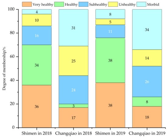Taking the Shimen hydropower station as an example, the calculated membership degree of the very healthy state was 36% in 2018 and increased to 38% in 2019, which was consistent with the actual situation. The proposed model appeared to accurately reflect changes in the river ecological restoration status after the retirement of Shimen. It unambiguously and accurately revealed the restoration process of the river’s ecological health after the small hydropower station was retired. The index weights calculated with the proposed combination method fell between the subjective weight and objective weight, indicating that the model fully incorporated both subjective and objective information.
