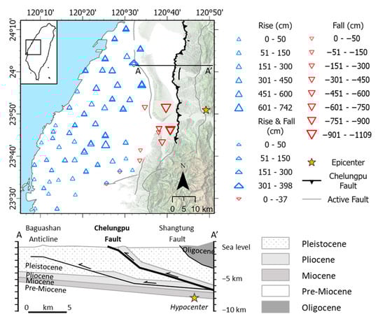 - Huang, M.H.; Tung, H.; Fielding, E.J.; Huang, H.H.; Liang, C.; Huang, C.; Hu, J.C. Multiple fault slip triggered above the 2016 Mw 6.4 MeiNong earthquake in Taiwan. Geophys. Res. Lett. 2016, 43, 7459–7467. [Google Scholar] [CrossRef]