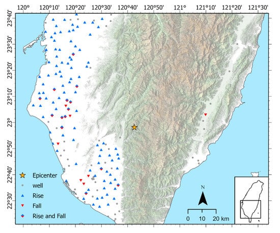 - Chia, Y.; Chiu, J.; Chung, P.Y.; Chang, Y.L.; Lai, W.C.; Kuan, Y.C. Spatial Distribution of Groundwater Level Changes Induced by the 2006 Hengchun Earthquake Doublet. Terr. Atmos. Ocean. Sci. 2009, 20, 315–324. [Google Scholar] [CrossRef]