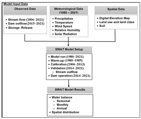 When constructing a SWAT model, spatial and temporal data, including topography, land use, soil, streamflow, reservoir, and streamflow, are utilized.