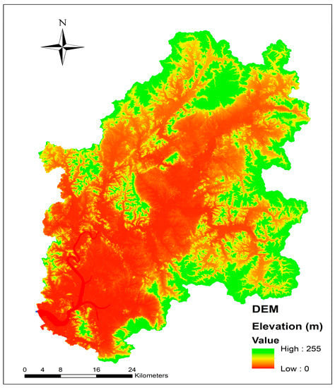 This study made use of the ASTER Global Digital Elevation Model (GDEM) of 30 × 30 m resolution DEM data (https://earthexplorer.usgs.gov/, accessed on 10 May 2022). Using ArcGIS, four ASTER GDAM grids were combined in creating a new raster. A universal transverse Mercator (UTM)-52N projection system was used. Sub-basins and stream networks were delineated using the DEM. The details of the DEM of the basin are given in Figure 3.