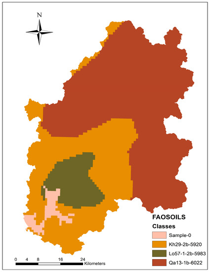 Based on the Harmonized World Soil Database (HWSD v121), the soil map of the Yeongsan river basin has a resolution of approximately 1 km (30 arc seconds) consisting of a topsoil layer (30 cm) and a subsoil layer (70 cm). The UTM-52N-projected soil map of various soil classifications and their corresponding SWAT codes on Table 1. Figure 4 depicts a map of the Yeongsan basin’s soil types with SWAT codes for various soil classifications.