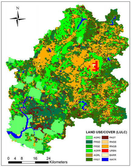 Yeongsan river basin’s land use map (approximately 400 resolutions) was extracted from the USGS EROS Archive—Land Cover Products—Global Land Cover Characterization (GLCC) map (https://swat.tamu.edu/data/, accessed on 12 May 2022).