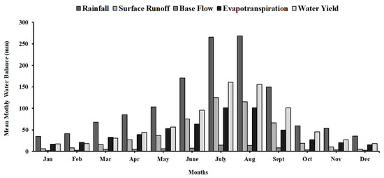 Annual water balance reveals that the maximum rainfall and ET were observed in August, the maximum surface runoff, base flow, and water yield were observed in July (Figure 7), which could be attributed to the initial abstraction losses in the form of soil absorption and evaporation from the basin, thereby reducing runoff contribution. The highest ET was observed in the month of August, which could be attributed to higher evaporation demands owing to higher soil moisture availability. Transpiration plays a key role in the water cycle, especially in our area of study, which is predominantly made up of cultivated crops and forest cover [30].