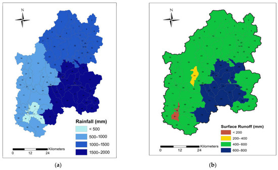 Spatial distribution of water balance across the sub-basins within the Yeongsan river watershed for rainfall, surface runoff, base flow, potential ET, and water yield was simulated from 1980–2021. Average annual rainfall ranged from 25.24 to 1573.92 mm, with the maximum level observed in the Jiseok stream sub-basin, the lower part of the upper Yeongsan river sub-basin, part of the Juksan weir sub-basin, and part of the Yeongam stream sub-basin, whereas the minimum rainfall occurred in the lower Yeongsan river sub-basin, parts of Yeongam stream sub-basin, and Yeongsan river estuary sub-basins (Figure 8a). Runoff and water availability are unevenly distributed in the sub-basins as a result of the variance in rainfall in the various sub-basins. The surface runoff contribution made up 38% of the basin’s total annual rainfall. Comparable to rainfall, the mid-sub-basins had the highest levels of surface runoff, while portions of the downstream sub-basins saw the lowest levels, with runoff values ranging from 490 to 730 mm (Figure 8b).