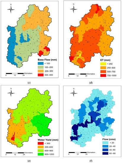 Figure 8d indicates that the average annual ET varied from 12 mm to 883 mm among the sub-basins. In the Yeongsan river basin, ET was higher in sub-basins with agriculture and forest covers and low in urban sub-basins. At the sub-basin scale, water yield varied from less than 300 to 1022 mm (Figure 8e). Water yield exhibited a similar pattern to rainfall due to factors, including land use/cover patterns, soil characteristics, and rainfall intensity. Figure 8f shows that the average stimulated streamflow is 0 m3/s to 70.63 m3/s throughout the sub-basins. Higher streamflows followed the same pattern as the Yeongsan river flow with the highest flows from the mid- to low-level basins.