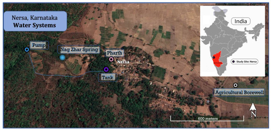 The study site is the village of Nersa located in Southwestern India (Figure 1)—specifically, the Khanapur Taluk of Belgaum District, Karnataka (15°36′00.26′′ N, 74°25′39.92′′ E). The village lies on the western edge of the Western Ghats Mountain range, which traverses north/south along the coast of India. Nersa’s elevation is approximately 700 m above sea level. The entire area is within the Krishna River Basin. The climate is sub-tropical. The mean annual rainfall is 1859 mm, of which 72% occurs during the monsoon from June to September [25]. Precipitation data were obtained from rain gauges at a field station in Belgaum, 40 km from the study site [26]. Agriculture is the main source of employment for the people of Nersa.
