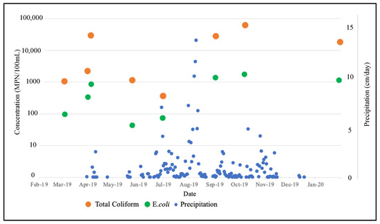 Time series of E. coli and total coliform in untreated water collected at the village’s main water source (Pharth). Precipitation data from rain gauges at Belgaum Sambra field station [26].