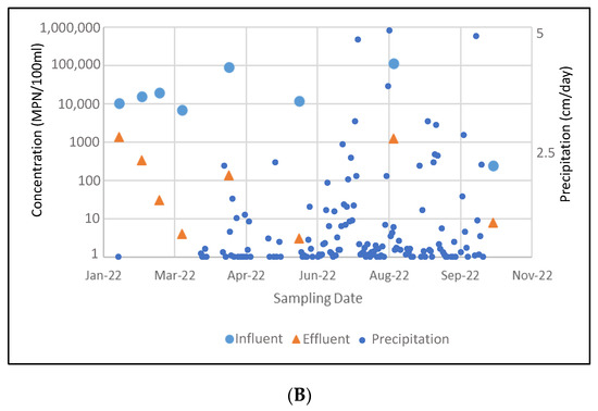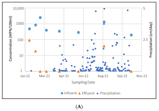 Over the entire testing period (January to October 2022), the IBF removed on average 96.96% of E. coli and 97.46% of total coliforms. Greater than 99% removal (~2.5 log units) was observed after the biolayer on the IBF was fully developed. This improvement is illustrated in Figure 5A,B, which show that the bacteria removal was lower than average during the initial three weeks of operation, when the biolayer on top of the IBF filter had not fully developed. Once formed, the E. coli concentrations in the filter effluent (Figure 5A) remained at or below the detection limit (1 MPN/100 mL), except in August, when, during the height of the monsoon rains, 40 MPN/100 mL were detected in the effluent from the filter systems (versus 1320 MPN/100 mL in the influent). Similar results were observed for total coliform bacteria. In other words, once the biofilm matured, an approximately three to four orders of magnitude decrease in total coliform concentration was recorded (Figure 5B). However, removal during the August 2022 monsoon was less efficient, when the influent concentration only dropped by two orders of magnitude, from 1.2 × 105 MPN/100 mL to 1.2 × 103 MPN/100 mL. This drop in efficiency was likely due to damage that occurred to the cover of the filter during heavy rain and wind, causing subsequent contamination and disturbance of the biolayer (i.e., rain was able to fall directly into the filter and the biolayer was disturbed by broken cover material). A longer study period would be needed to determine if this episodic reduction in performance is typical during the monsoon.