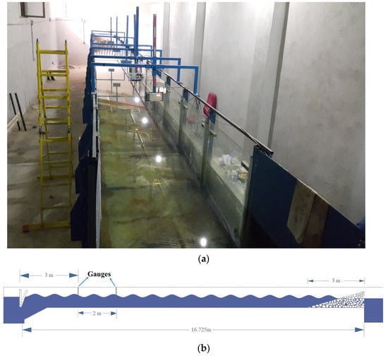 An overview of the experimental wavemaker tank: (a) a real picture and (b) schematic illustration.