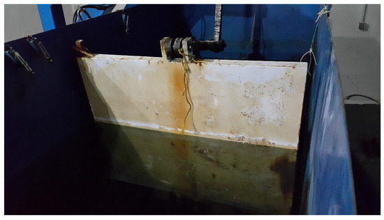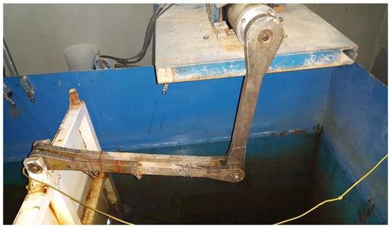 The generation of waves in the experimental wavemaker is carried out by a flap with 95 cm height, 96.5 cm width, and 5 cm thickness, which is hinged to the channel (Figure 2). As shown in Figure 3, the flap of the wavemaker is connected to a smart electric motor using two arms 65 cm and 50 cm long.