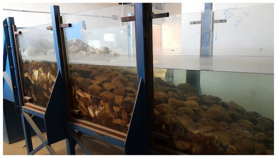 Because the wave tank is a rectangular cube with a closed end, a beach or wave absorb system is needed to dissipate or absorb the wave energy. For this purpose, an inclined stone beach was made at the end of the experimental wave tank (Figure 4). It should be mentioned that the free surface of the water becomes smooth after the collision with the beach in all experiments, which indicates the complete wave energy dissipation through the beach.