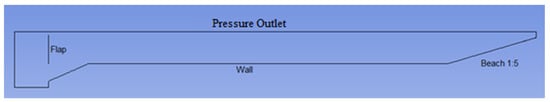 To simulate waves in the wave tank, all governing equations should be solved with the transient mode of Fluent software. The flow is laminar, and the multiphase model is activated using the VOF method. The boundary condition of the top boundary of the tank is selected for the flow of air; other boundaries are the wall with a 1:3 inclined beach (Figure 6).