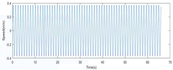 To fully simulate the flap movement of the laboratory wave tank, it is necessary to measure the displacement of the flap in each experiment. To measure the displacement of the flap, a meter was used along the x direction (length of the tank), and the amount of displacement was read with each rowing. After obtaining displacement, rowing motion was simulated using MATLAB software. To transfer flap motion to Fluent software, flap speed needs to be entered. It was derived from the flap motion equation in MATLAB software to obtain the flap speed, and then the flap speed obtained from MATLAB software was entered into Fluent. Figure 9 shows the flap movement in the x direction for each experiment, and Figure 10 shows the speed corresponding to it.