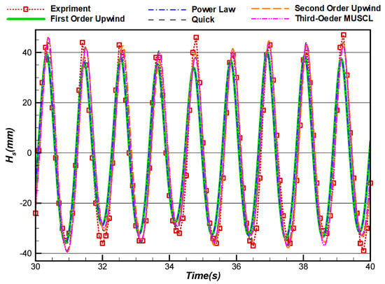 By using this method, the computational time becomes much faster than usual. Additionally, only two schemes exist in a transient mode in Fluent for the pressure–velocity coupling, named PISO and FSM algorithms, among which the PISO algorithm was selected in this work. For the spatial discretization of the momentum equation, different Fluent methods were used to model a sample wave, and the results were compared to find the best discretization scheme for the current work (Figure 13). As shown in Figure 9, since the results of the second-order upwind scheme were identical to higher schemes such as Quick and MUSCL schemes and this method was more stable and faster than the higher schemes, the second-order upwind scheme was used for the spatial discretization of the momentum equation.