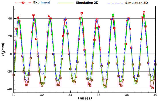 In many simulated problems, two-dimensional and three-dimensional results are similar to each other, and two-dimensional results are used to reduce computational costs. In this study, a three-dimensional wave tank was first analyzed, and then a two-dimensional wave tank was simulated. Two-dimensional, three-dimensional, and experimental results were compared for a sample case (Figure 14). The computational time of the 3-D problem was about 22 days using one CPU of an Intel Core 2 Quad operation machine (model name: i5-4400, number of CPUs: 4, CPU frequency: 3.1 GHz, and memory size: 16 GB), but for the 2-D one, it reached 9 h using the same computer. As can be seen from Figure 14, the comparison of the two-dimensional and three-dimensional results with the experimental ones shows that both numerical results are close to the experimental ones and that neither of them is superior to the other one. Therefore, to reduce the computational costs in this research, two-dimensional wave tank simulation was used for obtaining the results hereafter. It should be mentioned that the reason for the difference between 2-D and 3-D numerical simulations is that, in 3-D simulation, the entire wave tank is simulated with all actual details of the experimental wavemaker, and the effects of quantities and parameters in the z-direction such as the difference between the width of the flat paddle by the width of the tank impact the results.