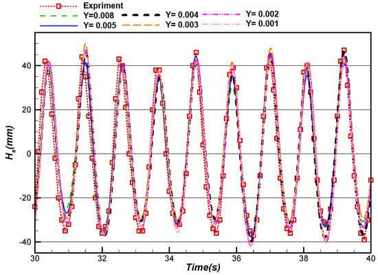 To maintain the quality of the mesh and to keep the maximum aspect ratio of the grids below 20, by reducing the mesh height of the cells at the common boundary of two fluids, the length of the cells should also reduce. Different mesh sizes are used to check the mesh independence of the numerical simulation as shown in Figure 15. In Figure 15, Y is the height of the cells in meters at the common boundary of two phases, and experimental results are also shown to validate the numerical results.