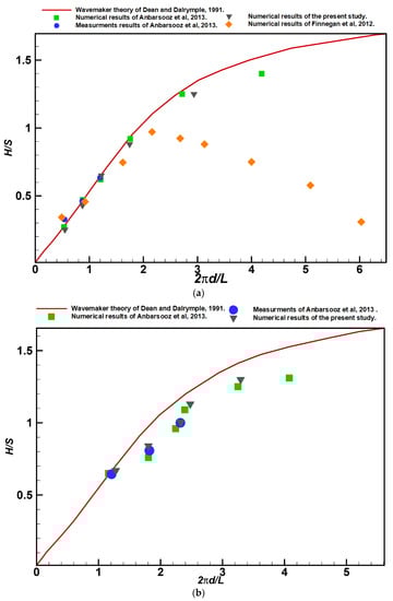 Comparison of the present results with other studies for (a) small wave steepness and (b) high wave steepness [,,].