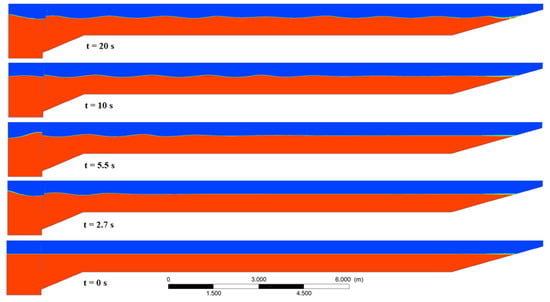 The waveform and the movement of the flap paddle in the numerical wave simulator are shown in Figure 17 at different times. As can be seen, with the passing of time, the waves are gradually created and moved from the tank to the beach slope.