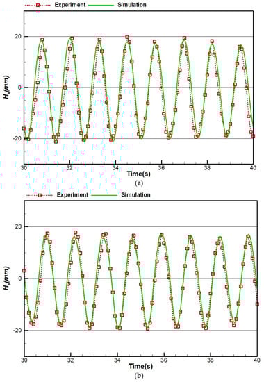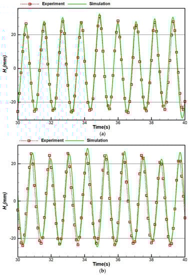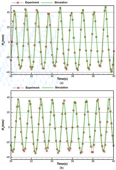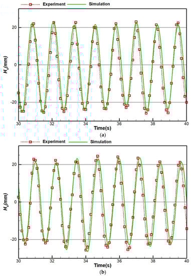 Figure 18 shows the results of case 1 for both experimental and numerical simulation. As demonstrated in Figure 18a,b, the numerical wave tank could properly simulate the experimentally generated wave. However, the accuracy has been reduced for the results at the distance of 5 m from the flap, and sometimes, the numerical results overshoot or undershoot the experimental results.