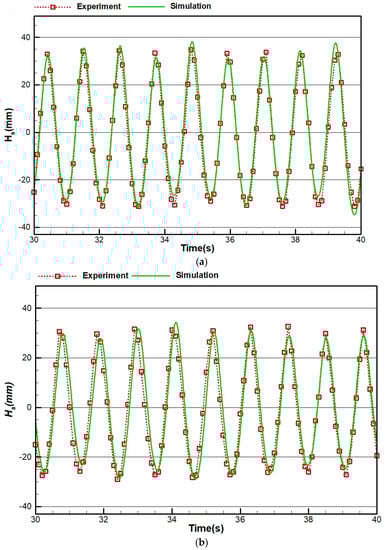 The results of experimental and numerical simulation for the waves are summarized, shown, and compared in Table 2. For each case, the height of the wave is plotted in a period of 30 to 40 s for the distances of 3 and 5 m of the flap.