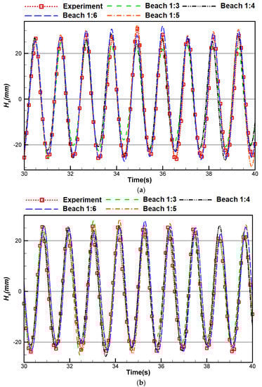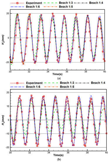 Wave height of case 5 for different beach slopes at a distance of (a) 3 m and (b) 5 m from the flap.