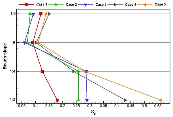 Results of the wave reflection coefficient for different beach slopes in different cases.