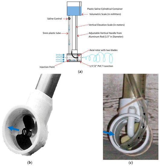 The main objective of this study was to investigate the effect of using a passive fan on flow measurement accuracy by way of the saline pulse technique. In order to ensure fast mixing of the salt tracer with the incoming water flow, a passive fan could be added and encased inside the tee junction of the saline injector stick (Figure 3a–c). The fan had an axial flow rotor that consisted of two blades, and the fan unit was encased inside the saline injector tee junction just downstream of the drainage point of the vertical 5 mm saline injector tube (Figure 3). The fan is described as a passive fan because it does not require power to rotate its blades. The blades often rotate freely when exposed to the flowing water stream. It was expected that the rotation of the blades could enhance mixing and thus reduce the required minimum mixing length.