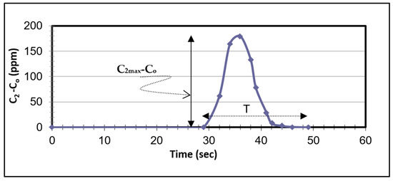 where Q is the estimated water flow in sewer pipe based on the pulse of tracer method (m3/s); g is the acceleration of gravity in (m/s2); T is the base time duration of salinity pulse (in sec) (refer to Figure 4); D is the pipe diameter in (m); C2max, Co, and Ct are the maximum downstream, background, and injected saline concentrations, respectively, in (ppm or mg/L); Rn is the flow Reynolds no.; and y is the water flow depth at the pipe outlet.