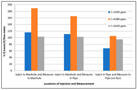 Based on the experimental results shown in Figure 5, it is noted that the setup arrangement described in Case 3 generally produced more favorable results than the setups of Cases 1 and 2. It is important to mention that injection of saline inside the upstream manhole (as per the setups in Cases 1 and 2) generally resulted in less accurate flow measurements.