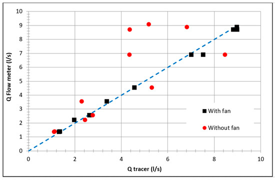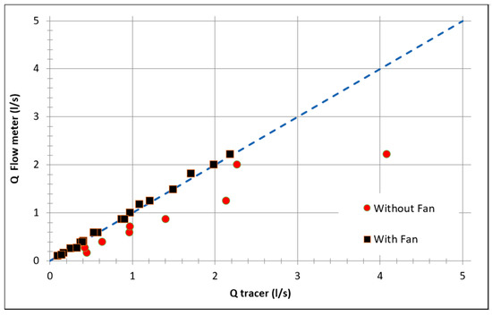 Figure 7 and Figure 8 show the comparison of the flow in the case of using the tracer technique and the flow meter technique for pipe sizes 60 mm and 150 mm, respectively. The diagonal line runs from the bottom left to the top right of the plot. It has a slope of unity that represents the “line of equality,” where all points that lie on it means the estimated flow from the indirect tracer method was the same as the measured flow from the flow meter method. Figure 7 and Figure 8 generally show that utilizing a passive rotor (fan) during the injection of the tracer significantly enhances the predictions of the tracer technique. Such an enhancement could be justified as the passive rotor helps in enhancing mixing by creating a spiral motion that extends to a relatively long distance. This spiral motion is expected to better mix the tracer with the incoming water flux. Moreover, the rotor is expected also to increase the water turbulence, which also enhances mixing. A recent CFD study on the passive rotor [5] has concluded that the spiral motion generated by the passive rotor could extend to a relatively long distance (about ten times the diameter of the injection stack outlet). The passive rotor also helps in significantly increasing the turbulence intensity in a distance of about four times the diameter of the pipe stack outlet in the near field zone downstream.