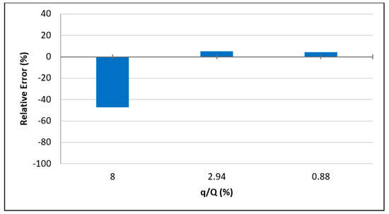 It is important to identify the most recommended injection rate of tracer (q) to be adopted in the flow measurement process. To study the injection-rate effect of the tracer on the accuracy of the indirect estimation of the water flow, the normalized relative error (Rerr) was applied. The normalized relative error is a dimensionless variable that could be defined mathematically as Rerr = (Q_tracer − Q_flow meter)/Q_flow meter). It is clear to say that the smaller the relative error, the higher the accuracy will be, and that a positive value of Rerr implies an overestimation by the tracer technique compared to the flow meter value, whereas vice versa would mean an underestimation of the same.