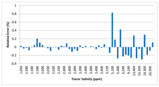Based on common practice, the concentration of the tracer should be high enough to be easily detected and measured, but low enough to not have a significant impact on the properties of the water being measured. Figure 10 shows the effect of the concentration of the injected tracer on relative error for both the 60 mm and 150 mm pipe cases. The Figure shows that relative error significantly increases above a concentration of 4000 ppm. The common practice for using a tracer dilution method for discharge measurements in river is to use a concentration of 3000 ppm [30], which does not contradict the presented result. Based on the study in hand, it is recommended to use an initial tracer concentration that ranges from 1000 ppm to about 3500 ppm to achieve high precision. The noted significant reduction in accuracy in the case of using concentrations of tracers greater than 4000 ppm could be due to the need for longer mixing lengths to completely mix denser solutions.