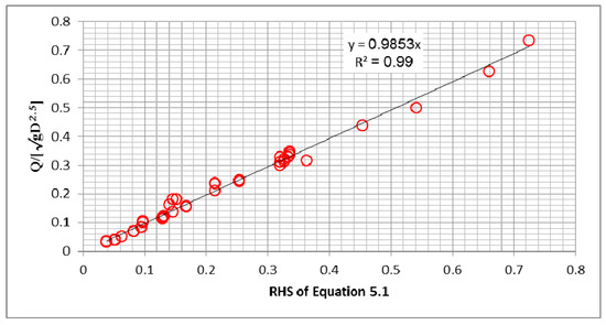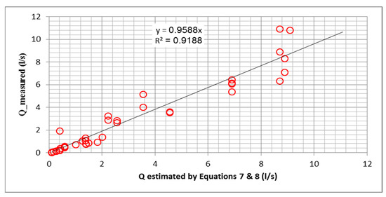 Two regression formulas (based on Equation (5), refer to Table 2) were derived based on the pulse of tracer technique. The corresponding coefficients for each formula are given in Table 2. The corresponding coefficient of determination (R2 values) is also listed in the last column of the same table. The application of the first regression formula is presented in Figure 11, which shows the agreement of the formula with the measurements.