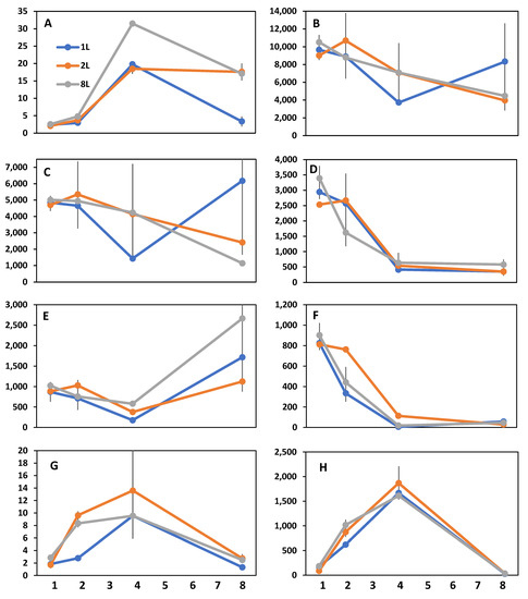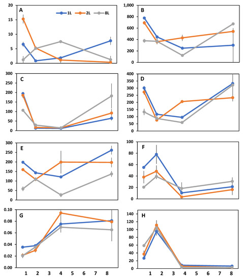 (A) Chlorophyll a concentration (µg L−1) and (B–H) abundance (×104 cell L−1) of phytoplankton in the autumn experiment. (A) Chlorophyll a concentration; (B) total abundance; (C) cyanobacteria; (D) eukaryotic picophytoplankton; (E) plastidic nanoflagellates; (F) cryptophytes; (G) dinoflagellates; and (H) diatoms, observed in bottles with variable volumes (1 L, 2 L, 8 L), subject to periods of incubation with the duration of 1 to 8 days. Vertical lines on each bar represent ±1 standard error of the mean.