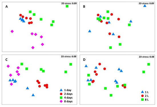 Non-metric multidimensional scaling (nMDS) plot of phytoplankton community structure across experimental durations in the (A) autumn and (C) summer experiments, and experimental volumes in the (B) autumn and (D) summer experiments. nMDS plots are based on Bray–Curtis similarities and non-transformed abundance data.