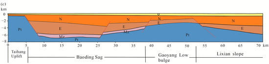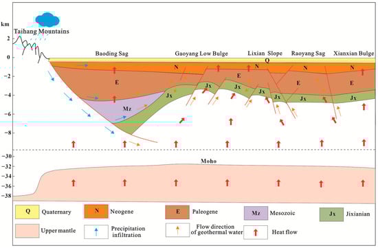 The Jizhong Depression is a typical Meso-Cenozoic fault basin (Figure 1) located in the northwestern part of the Bohai Bay Basin, which consists of 12 small- to medium-sized half grabens developed on the basement of the Yanshan movement, with the Paleocene as the main sedimentary body, and seven bumps and low bumps jointly []. The area is divided into a western depression zone and an eastern depression zone bounded by the Gaoyang-Wuji low relief in the central part of the area, as well as the Niouma Town relief and the Hexiwu tectonic belt, and these tectonic units constitute a “two sag and one uplift” pattern of NNE-NE-oriented spreading []. This study includes four tectonic units, which are the Baoding sag, the Gaoyang low bulge, the Lixian slope, and the Rao Yang sag, in order from northwest to southeast. The Jizhong Depression, where the study area is located, has experienced many phases of tectonic activities since the Paleozoic, from the stable depositional stage from the Middle Neoproterozoic to the Paleozoic, to the uplift and folding stage in the Mesozoic, to the rupture stage in the Paleocene, and finally to the stage of depression in the Neocene to the present day, and has developed the metamorphism of the Paleozoic, the marine carbonate rocks from the Middle Neoproterozoic to the Middle Ordovician, the marine and terrestrial interbedded clastics with carbonate rocks in the Permian, and the sandstone and mudstone sediments of the lacustrine and riverine phases in the Paleocene to the Quaternary. The general stratigraphy of the area is characterized by the deposition of metamorphic rocks of the Paleoproterozoic and Palaeoproterozoic (Great Wall and Jixian), Paleoproterozoic (Cambrian and Ordovician), Mesoproterozoic (Jurassic and Cretaceous) and Cenozoic (Paleocene, Neoproterozoic and Quaternary) on top of the crystalline basement of the Palaeoproterozoic-Palaeoproterozoic metamorphic rocks, among which the Paleoproterozoic and Jixian formations are in an angularly unconformable contact. This tectonic pattern of the basin basement and the development of sandstone and carbonate thermal reservoirs provide good geological conditions for the transport and storage of deep heat sources [,].