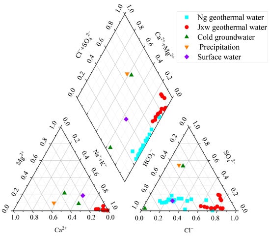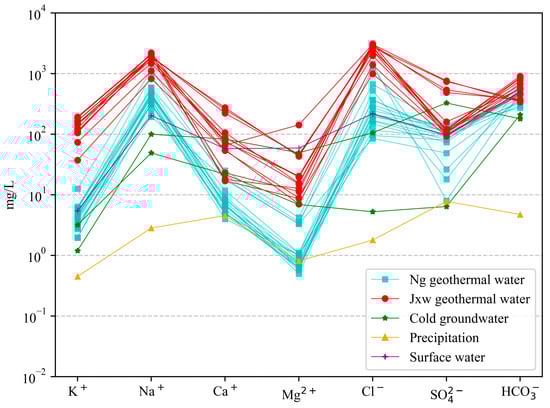 According to the results of the Schoeller diagram (Figure 5), Ca2+, Mg2+, and HCO3− in Jxw hot storage are higher than in Ng hot storage in the study area, which is mainly caused by the difference in lithology of the different hot storages. The lithology of Jxw hot storage is mainly composed of dolomite, and the main mineral fractions are dolomite and calcite; Ca2+, Mg2+, HCO3− derive mainly from the dissolution of these carbonate minerals. The main ions of the water samples—Na+, K+, Cl−—are greater in Jxw thermal storage than in Ng thermal storage. The reason is that the water circulation path of Jxw thermal storage is longer, the dissolution and filtration is more adequate, and the soluble materials in the surrounding rocks enter into the hot water in large quantities. The ion concentration in the sandstone thermal storage is relatively low, which indicates that it circulates relatively fast and the flow-through speed is greater. There is a difference in the trend of ion changes between the geothermal water and the cold groundwater, indicating that they are not clearly hydraulically connected.