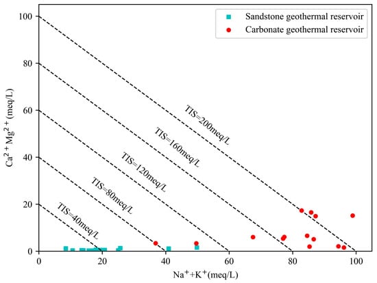 From Figure 3, it can be seen that the cations of the geothermal fluids of sandstone thermal storage and carbonate thermal storage in the study area are mainly dominated by Na+, and the anions are mainly dominated by HCO3− and Cl−. The high concentration of Na+ and Cl− in the Jxw thermal storage also reflects the long hot water runoff time in its deeper part and deeper hot water metamorphism []. According to Shukarev’s classification [], the hydrochemical types of geothermal fluids in sandstone thermal storage in the study area are mainly of the Cl·HCO3−Na type, the geothermal fluids in carbonate thermal storage are mainly of the Cl-Na and Cl·HCO3−Na types, and the shallow subsurface cold water is of the SO4−Na·Ca and HCO3−Na·Ca type water. According to studies by Apollaro et al. [], the iso–ionic–salinity (TIS) lines were added in the correlation plot of (Na+ + K+) vs. (Ca2+ + Mg2+) to reflect the ionic salinity. As shown in Figure 4, the content of Ca2+ and Mg2+ is lower than that of Na++ K+ on the whole, and the total ionic salinity (TIS) of water ranges from 10.95 to 114.05 meq/L.