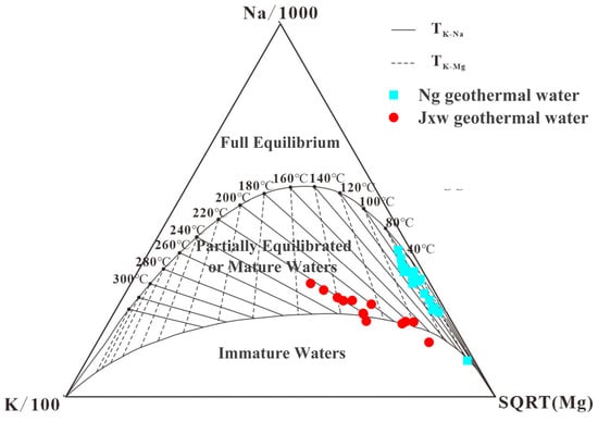 Judging whether the ions in the geothermal fluid reach the equilibrium state is a prerequisite for calculating the thermal storage temperature using the geothermal temperature scale; therefore, before using the geothermal temperature scale for calculation, it should be judged whether the geothermal fluid reaches the water–rock equilibrium or not. Nowadays, the Na-K-Mg triangulation diagram is often used to classify the geothermal fluid into three types: fully equilibrated, partially equilibrated, and immature water [], according to the water–rock equilibrium state and whether there is cold water mixing []. The Na, K, and Mg contents in the geothermal fluid samples in the study area were linearly transformed and put into the Na-K-Mg triangular diagram, and according to their position, we can judge whether the ions in the water samples reached the equilibrium state.