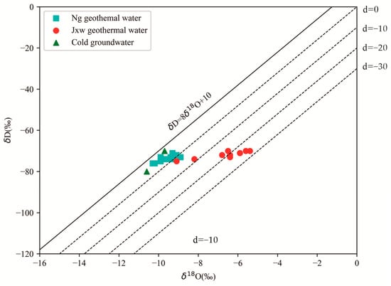 Hydrogen and oxygen isotopes are good tracers, and the recharge and elevation of groundwater during circulation can be represented by their distribution characteristics []. Using the hydrogen and oxygen isotope standards (Standard Mean Ocean Water, SMOW) determined by Craig [] and the global atmospheric waterline equation (δ D = 8δ18O + 10), the study area can be divided into Ng geothermal water, Jxw geothermal water, and shallow groundwater. A plot of δD versus δ18O is shown in Figure 9. The solid line in Figure 9 represents the global atmospheric water line (GMWL), while the dashed line represents the deuterium excess parameter (d), where d can be used to measure the degree of exchange of 18O between the geothermal water and rocks. The smaller the d value is, the smaller the runoff velocity of the geothermal water is, the longer the retention time in the aquifer is, and the stronger the water–rock reaction is. The expression for d is d = δD − 8. The 18O and d values are not affected by factors such as the season and height, and their values are constant [].