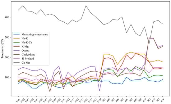 The thermal storage temperatures were calculated by each temperature scale and the results are shown in Table 2. The calculated ranges of Ng thermal storage in the study area using Na-K, Na-K-Ca, K-Mg, Ca-Mg, Quartz, Chalcedony, and the SI Method were 54.48–106.59 °C, 55.18–87.28 °C, 53.23–103.1 °C, 364.31–457.66 °C, 53.23–103.1 °C, respectively, 32.2–155.61 °C, 27.44–131.09 °C and 71–99 °C, while the calculated ranges of Jxw heat storage in the study area were 164.08–106.59 °C, 97–154.32 °C, 129.18–217.57 °C, 265.41–401.85 °C, 133.07–293.81 °C, 105.93–297.4 °C, and 110–153 °C, respectively. According to the comparison results, it can be seen that the Jxw thermal storage temperature derived using each temperature scale calculation method is higher than the Ng thermal storage, i.e., the thermal storage temperature of the deep Jixian carbonate samples is higher than that of the shallow Neoproterozoic sandstone thermal storage.