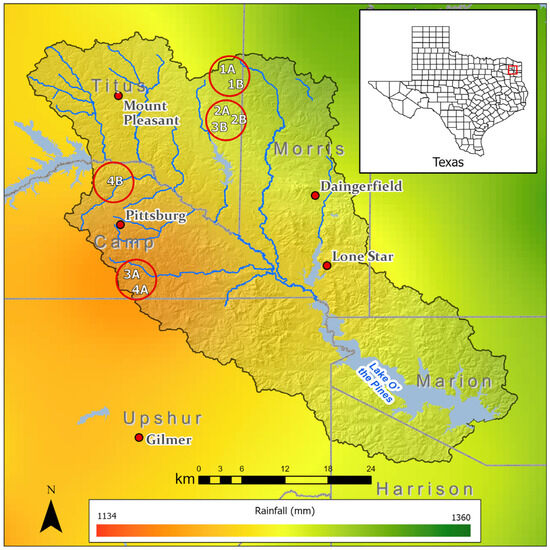 The monitoring program for this study was established on multiple private properties practicing BMP implementation recommendations through the NRCS NWQI program in the Lake O’ the Pines watershed (Figure 1). The mean annual precipitation for the area varies on a gradient from west (1134 mm) to east (1360 mm) (Figure 1) and is largely well dispersed throughout the year [37,38,39]. Summers are typically hot and humid, and winters are mild and cool [39]. Watershed elevation varies from 61 m to 187 m above the mean sea level [39,40]. Soils are derived from the Sabine Uplift and are predominantly sandy in nature, with more than 90% of the total area consisting of sandy or sandy loam soils [39,40,41,42].