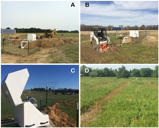 Autosampler deployment used in this study. Berm construction (A) and maintenance (B) on a farm-scale site; autosampler maintenance (C) on a continuous grazing site; and field-scale silvopasture planting (D) with seedlings planted in rows.