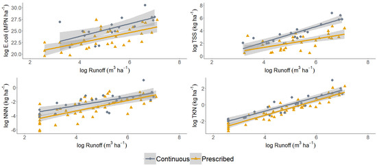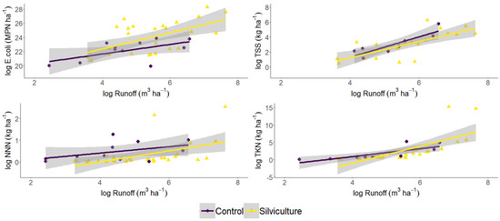 Implementing silvicultural practices produced mixed results. Treatment was a significant factor in observed loads for NNN, TKN, and OP (p < 0.05), but not for TSS, E. coli, or P (p ≥ 0.09) (Table S2). Of these, only NNN loads were lower for treatment plots. Interestingly, TKN and OP loads from the control were lower than from the treatment. Runoff volume was a significant predictor of TSS, TKN, OP, and P (p < 0.01), but not for NNN or E. coli (p ≥ 0.09) (Figure 4, Figures S1 and S2).