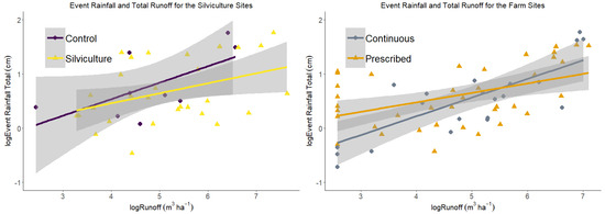 Natural forest revegetation (control) versus silvicultural BMP and prescribed versus continuous grazing runoff volume (m3 ha−1) and event total rainfall (cm). The data displayed is the averaged data for all two years of the study. The grey shading represents the 95% confidence interval.