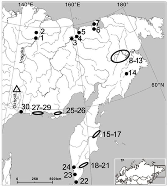 - Baranova, Y.P.; Biske, S.F. North-East of the USSR; Nauka: Moscow, Russia, 1964; pp. 1–304. (In Russian) [Google Scholar]