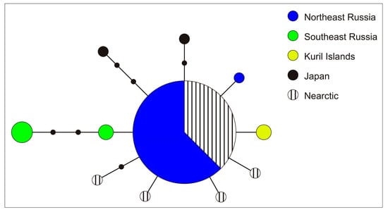 Our genetic analysis of four populations from Northeast Asia confirmed that they belong to the same species, B. beringiana. Genetic variation in B. beringiana is low, as is evident from the haplotype network (Figure 4), suggesting recent divergence of populations and their dispersal through the current range. The network corresponds to a classical star-like cluster [42], in which a central haplotype is usually considered ancestral and the others are thought to be its derivatives formed by accumulating substitutions. It is also possible to assume in our case that the large size of the central (“basic”) haplotype in the network is explained by the fact that more mussels were examined in samples from northern populations compared with southern ones. While the same haplotype is found in Northeast Asia, Sakhalin, and Alaska, various haplotypes are characteristic of Primorye, the Kuril Islands, and Japan. A center of genetic diversity of B. beringiana is likely to be in the south, but the available data on southern regions are insufficient for deciding whether the center should be sought on the continent or islands. This question will be resolved by extensive sampling.